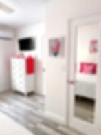 THE BRIGHT PINK ACCENTS WELCOME YOU IN THE SECOND BEDROOM. FEATURING 2 FULL SIZE BEDS, 32' SMART TV, SPACIOUS CLOSET WITH SAFE AND PRIVATE FULL BATHROOM.